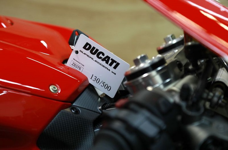 A tag marking a Ducati Superleggera V4 as one of 500 in existence is visible after the motorcycle was unboxed at Bayside Harley Davidson on Wednesday, Sept. 16, 2020, in Portsmouth, Va. (Kaitlin McKeown/Virginia Media) Cynthia Slaughter plopped down a $20,000 deposit while her husband was in another part of the factory. She shared the surprise with their two children, Tiara and Will, but otherwise kept it a secret.