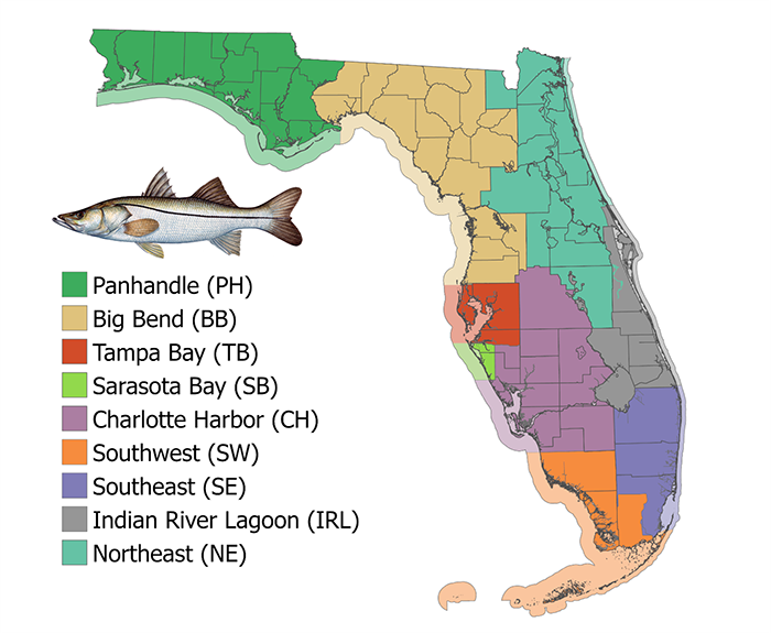 The regional management regions are part of the Florida Fish and Wildlife Conservation Commission’s (FWC) holistic management approach for Florida’s most popular inshore fisheries. This approach uses seven metrics to evaluate the fishery by region, allowing the FWC to be more responsive to local concerns. To learn more, visit MyFWC.com/Snook. This page includes the snook annual reviews, which provide summaries of key findings from the annual evaluation of management metrics for each region.