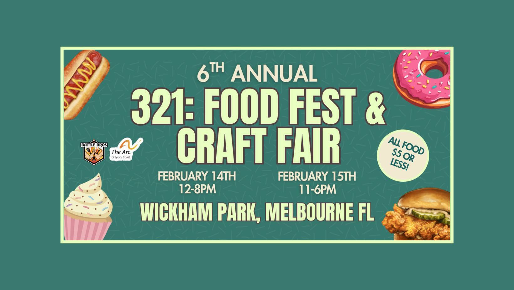 • ALL ATTENDEES Ages 11 Years & Older Will Require an Admission Ticket 2 day event, Saturday, February 14th, 2026, Noon - 8 PM and Sunday February 15th, 2026, 11am - 6pm with the opportunity to come and go at your convenience or stay and party with us all day & into the night! Brevard County's largest FOOD FESTIVAL, featuring EVENT SPECIAL A LA CARTE TASTING MENUS priced at only $1-$5 per item, offering you the opportunity to sample a vast variety of all the best from the Space Coast and Beyond all in one place! Large variety of Alcohol, including Cocktails, Flavored Margaritas, Hard Seltzers, Spiked Lemonades, Local Craft Brews, Domestic and Import Beers, and Non-Alcoholic Beverages! Live Music from the area's HOTTEST BANDS to keep the good vibes going all day & into the night! CRAFT FAIR Marketplace featuring Local Businesses, Crafters, Artists, and Specialty Artisans! Axe Throwing, Mechanical Bull, Face Painting, Permanent Jewelry & other on-site activities to add to the fun! FREE Kids Zone with Bounce Houses and Obstacle Courses! Vote for your favorite food in the Competition part of the event via QR codes at the event! See 321FoodFest.com for all our food vendors PLEASE NOTE:*No Refunds or Exchanges - Rain or Shine Event*No outside food or drink will be permitted inside the event*Event participants subject to change for reasons out of our control*Taxes and fees apply*Must be 21+ with Valid ID to purchase and consume alcohol - Please Drink Responsibly*Battle Bros LLC, the 321: Food Fest, and The Arc of Space Coast are NOT responsible for third party ticket sales