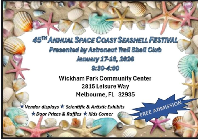 FREE ADMISSION: The Festival will have Seashells from all around the world including our local area and the state of Florida. We will have Vendors selling shells and Scientific and Artistic Exhibits. Door Prizes & Raffles & a great KIDS corner.