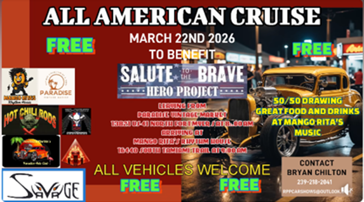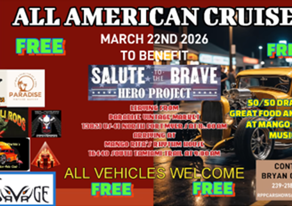 We will be cruising from Paradise Vintage Market 13821 US-41 South North FT Myers to Mango Rita's Rhythm House 16440 South Tamiami Trail Fort Myers to have a great cars and coffee.