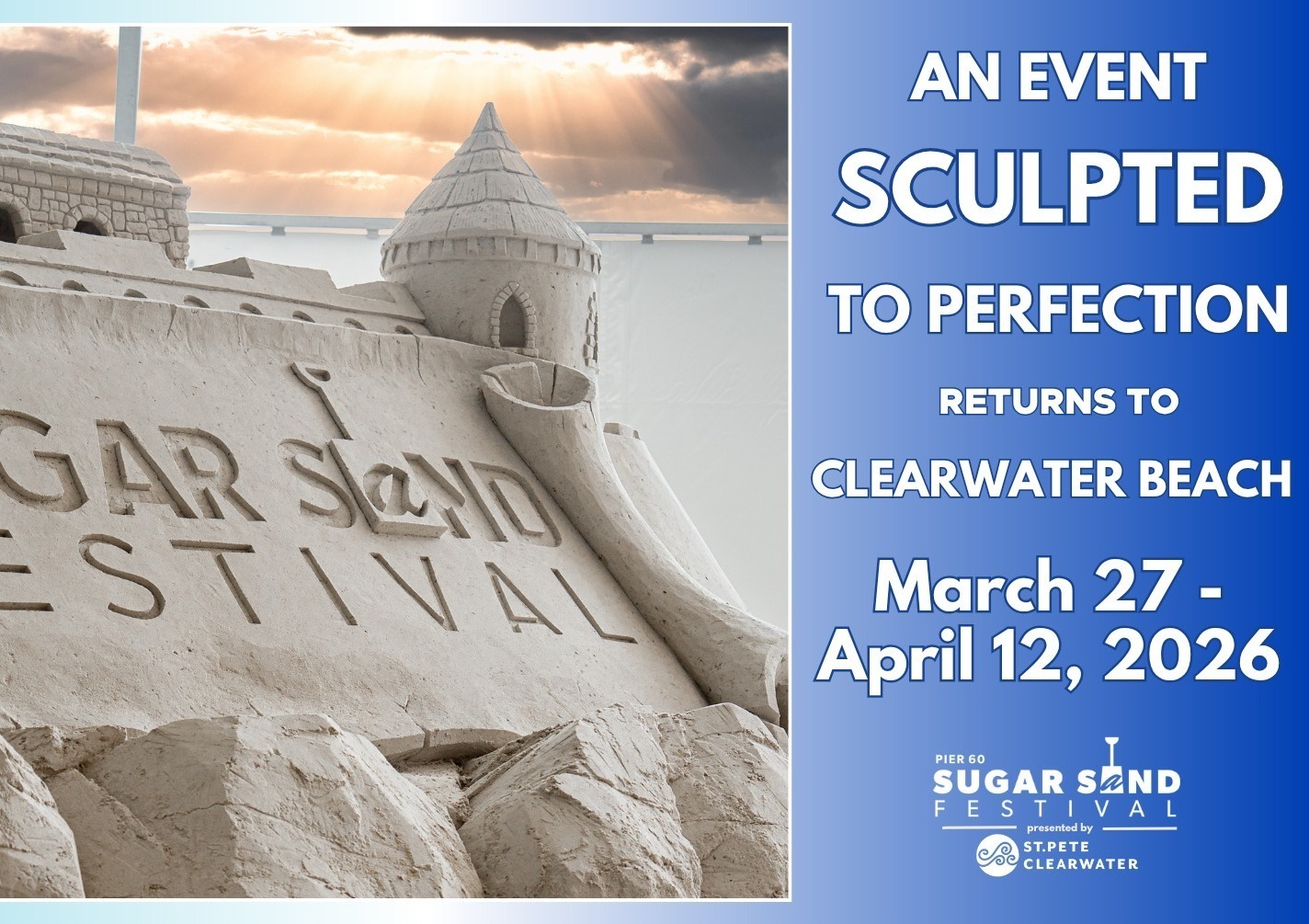 The Pier 60 Sugar Sand Festival presented by Visit St. Pete-Clearwater returns to Clearwater Beach March 27 - April 12, 2026!